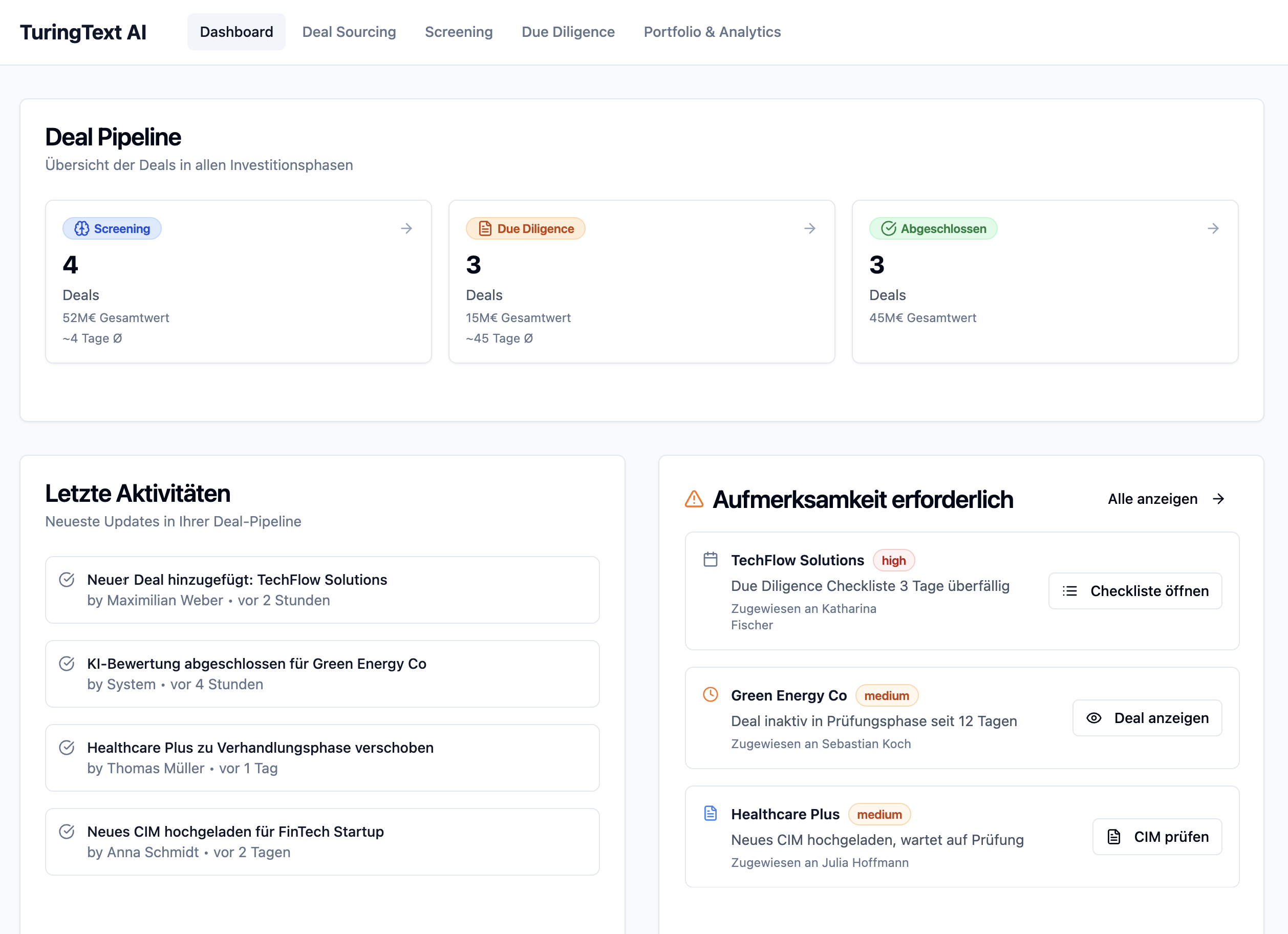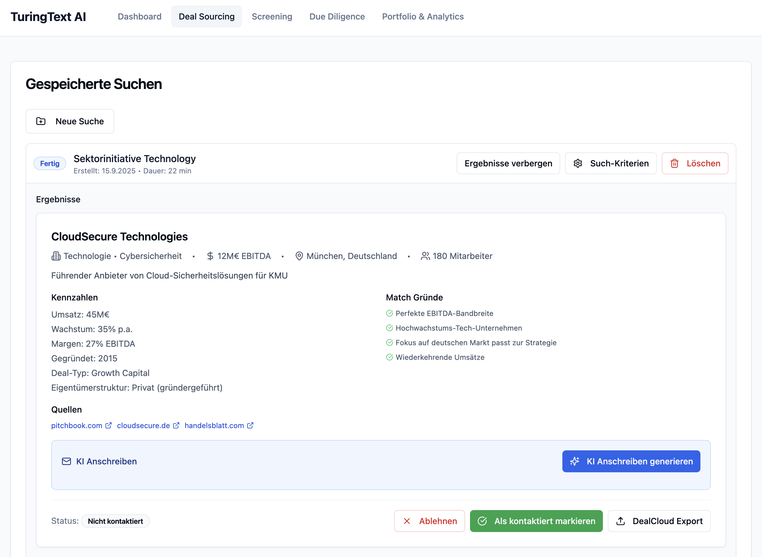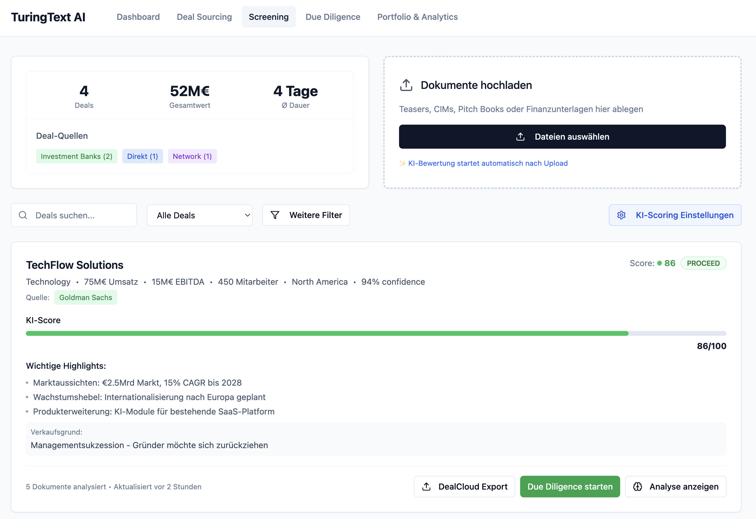 Wichtige Kennzahlen in Sekunden statt Stunden. Laden Sie Teaser, Memos oder Pitchbooks hoch – unsere KI extrahiert automatisch Umsatz, EBITDA, Wachstum und mehr. Ihre Deals werden sofort nach Relevanz für Ihren Fonds bewertet.